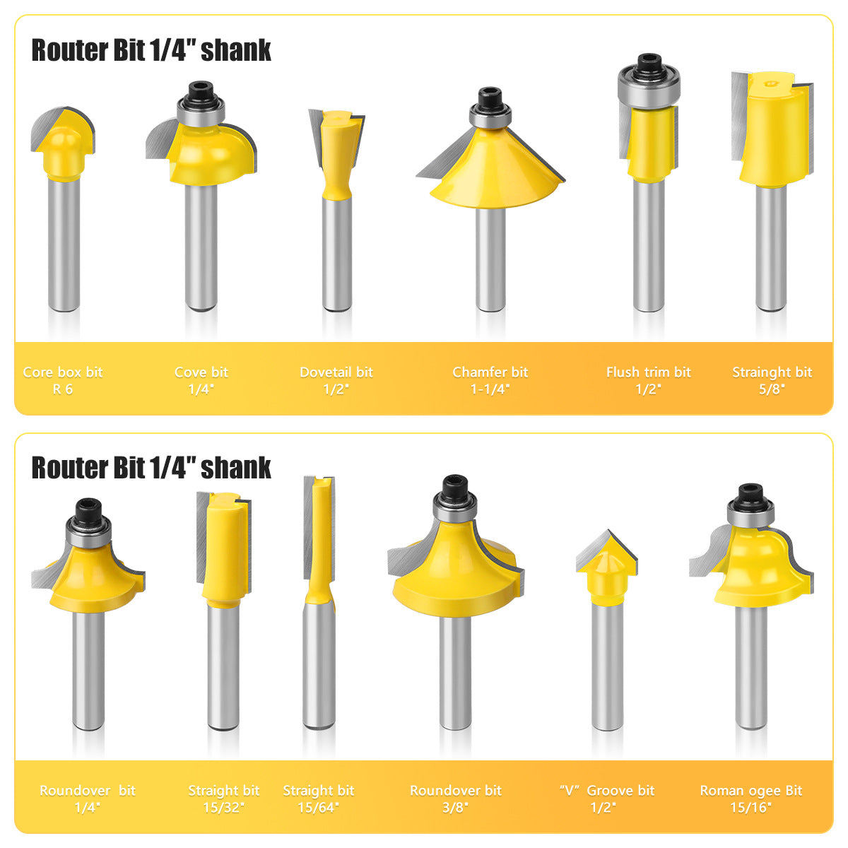 12-Piece set of 1/4 handle woodworking milling cutter set, trimming machine cutter head, bakelite milling engraving machine milling cutter, trimming cutter 15PC