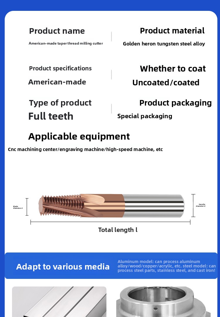 Tungsten Steel Alloy US Tapered Pipe Thread Milling Cutter Aluminum Coating CNC Machining Center
